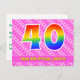 El frente de este diseño de tarjeta postal temática de cumpleaños, amorosa, animada y divertida, presenta un gran número "40" con un patrón inspirado en el gradiente del espectro del arcoíris. También presenta el mensaje "Feliz cumpleaños 40," y un nombre de destinatario editable. El frente además tiene un patrón feliz de rayas rosadas oscuras y rosadas claras con formas de corazón. La parte trasera presenta un mensaje de saludo de cumpleaños personalizado, o quizás podría ser borrado y dejado en blanco si se desea escribir un mensaje a mano en su lugar. Una tarjeta postal de cumpleaños personalizada como esta podría ser una forma divertida de enviar un mensaje en celebración del cumpleaños número cuarenta de alguien. Tarjetas postales como esta también podrían ser utilizadas para invitar a los invitados a una celebración de cumpleaños o fiesta que se celebra para alguien que está cumpliendo 40 años.