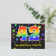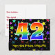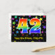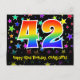 El frente de este diseño de tarjeta postal temática de cumpleaños, colorido, divertido y emocionante, presenta un gran número "42" con un patrón inspirado en gradiente de espectro de arcoíris, junto con el mensaje "Feliz cumpleaños 42" y un nombre de destinatario editable. La parte delantera presenta además un patrón de fondo vibrante y colorido con formas de estrellas de diferentes tamaños. La parte trasera presenta un mensaje de saludo de cumpleaños personalizado, o quizás podría estar despejado y dejado en blanco si se desea escribir un mensaje a mano. Una tarjeta postal de cumpleaños como esta podría ser una forma divertida de enviar deseos de cumpleaños a alguien que está celebrando su cumpleaños número cuarenta y dos. Tarjetas postales como esta también podrían usarse para invitar a invitados a una fiesta de cumpleaños o celebración que se organice para alguien que cumple 42 años. [~Z0000447