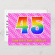 El frente de este diseño de tarjeta postal de cumpleaños animado, feliz y divertido presenta un gran número "45" con un patrón de gradiente de espectro de arcoíris. También presenta el mensaje "Feliz cumpleaños 45" y un nombre de destinatario personalizable. La parte delantera también tiene un patrón alegre a rayas rosa oscuro y rosa claro con formas de corazón. La parte trasera incluye un mensaje de saludo de cumpleaños personalizado, o quizás podría estar en blanco si se desea escribir un mensaje a mano. Una tarjeta postal de cumpleaños personalizable como esta podría ser una forma divertida de enviar un mensaje para celebrar el cumpleaños número cuarenta y cinco de alguien. Tarjetas postales como esta también podrían usarse para invitar a invitados a una celebración de cumpleaños o fiesta que se organice para alguien que cumpla 45 años.
