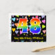 El frente de este diseño de tarjeta postal temática de cumpleaños, colorido, divertido y emocionante, presenta un gran número "48" con un patrón inspirado en gradiente de espectro de arcoíris, junto con el mensaje "Feliz cumpleaños 48", y un nombre de destinatario personalizado. La parte delantera presenta además un patrón colorido y vibrante de corazones amorosos. La parte trasera presenta un mensaje de saludo de cumpleaños editable, o quizás podría borrarse y dejarse en blanco si se desea escribir un mensaje a mano. Una tarjeta postal de cumpleaños personalizable como esta podría ser una forma divertida de enviar un mensaje para celebrar el cumpleaños número cuarenta y ocho de alguien. Tarjetas postales como esta también podrían usarse para invitar a invitados a una celebración de cumpleaños o fiesta que se organice para alguien que cumple 48 años. [~Z0000448]