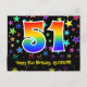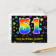 El frente de este diseño de tarjeta postal temática de cumpleaños emocionante, divertido y colorido presenta un gran número "51" con un patrón inspirado en gradiente de espectro de arcoíris. También presenta el mensaje "Feliz cumpleaños 51" y un nombre de destinatario personalizable. La parte delantera también presenta un patrón colorido y vibrante de formas de estrellas. La parte trasera presenta un mensaje de saludo de cumpleaños personalizado, o quizás podría estar en blanco si se desea escribir un mensaje a mano en su lugar. Una tarjeta postal de cumpleaños personalizada como esta podría ser una forma divertida de enviar un mensaje para celebrar el cumpleaños número cincuenta y uno de alguien. Las tarjetas postales como esta también podrían utilizarse para invitar a los invitados a una fiesta de cumpleaños que se celebra para alguien que cumple 51 años.