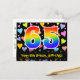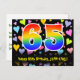 El frente de este emocionante, colorido y cariñoso diseño de tarjeta postal de cumpleaños presenta un gran número "65" con un patrón de gradiente de espectro de arcoíris. También presenta el mensaje "Feliz cumpleaños 65" y un nombre de destinatario editable. La parte delantera también tiene un patrón vibrante y colorido de corazones cariñosos. La parte trasera presenta un mensaje de saludo de cumpleaños personalizado, o quizás podría estar despejado y dejado en blanco si se va a escribir un mensaje a mano en su lugar. Una tarjeta postal de cumpleaños como esta podría ser una forma divertida de enviar deseos de cumpleaños a alguien que está celebrando su cumpleaños número sesenta y cinco. Las tarjetas postales como esta también podrían utilizarse para invitar a los invitados a una celebración de cumpleaños que se celebra para alguien que cumple 65 años.