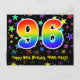 El frente de este diseño de tarjeta postal temática de cumpleaños, colorido, emocionante y divertido, presenta un gran número "96" con un patrón inspirado en el gradiente del espectro del arcoíris, junto con el mensaje "Feliz cumpleaños 96", y un nombre de destinatario editable. La parte delantera presenta además un fondo vibrante y colorido con un patrón de formas de estrellas. La parte posterior presenta un mensaje de felicitación de cumpleaños editable, o quizás podría borrarse y dejarse en blanco si se desea escribir un mensaje a mano. Una tarjeta postal de cumpleaños personalizable como esta podría ser una forma divertida de enviar un mensaje para celebrar el cumpleaños número noventa y seis de alguien. Tarjetas postales como esta también podrían usarse para invitar a invitados a una fiesta de cumpleaños que se celebra para alguien que cumple 96 años. [~Z0000447]