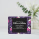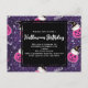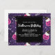 Invitación de cumpleaños de Halloween con un adorable patrón temático de Halloween. Gatos con sombreros de brujas, sentados en calabazas rosas con telarañas moradas en el fondo.