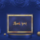 Una tarjeta de agradecimiento para un cumpleaños importante. Un color de fondo azul marino oscuro y un marco dorado falso. El color azul es desigual. En la parte delantera, un estilo de letra a mano y el texto: ¡Gracias!