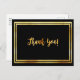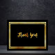 Una tarjeta de agradecimiento para un cumpleaños aniversario. Un color de fondo negro y un marco de oro falso. En la parte delantera, un estilo de letra a mano y el texto: ¡Gracias! Parte trasera: Plantilla para tu nota de agradecimiento y nombre. Sin color de fondo.