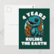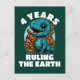 Cumpleaños de cuatro años del dinosaurio bebé gobernando la tierra. Diseño gráfico para celebrar un cuarto cumpleaños.