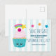 Una tarjeta postal de guardar la fecha de cumpleaños (u otro evento) con un fondo a rayas azul claro y blanco. Superpuesto en la parte superior hay un adorable cupcake azul con glaseado rosa y una cara sonriente kawaii. Una cereza en la parte superior también tiene una cara adorable. Una estrella fugaz está volando en el aire.