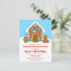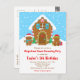 Esta linda y festiva invitación de cumpleaños presenta una adorable casa de pan de jengibre decorada con dulces rojos y verdes. Al lado hay adorables hombres de pan de jengibre con regalos, vestidos con sombreros y bufandas de Santa. En el fondo hay un brillante cielo invernal azul con elegantes copos de nieve que caen. El texto combina fuentes decorativas y sans serif para un look elegante y moderno. Esto es perfecto para una fiesta de decoración de casas de pan de jengibre en Navidad.
