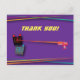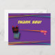 Utilice estas prácticas tarjetas postales para decir gracias por venir a su fiesta de tag de láser. Personalice la parte delantera y trasera con su propio mensaje. El diseño tiene rayos láser disparando en diferentes direcciones. Una pistola phaser está disparando hacia un chaleco negro y rojo. Este diseño se coordina con esta invitación: