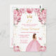 Esta elegante y glamurosa invitación de cumpleaños presenta a una hermosa princesa con cabello marrón en un vestido de baile rosa claro. El texto combina letra manuscrita y fuentes modernas sans serif para un look clásico y sofisticado. Los arreglos florales, la mariposa y el confeti dorado crean la mezcla perfecta de rústico y chic.