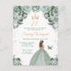 Esta elegante y glamurosa invitación de cumpleaños presenta a una hermosa princesa con cabello marrón en un vestido de gala verde salvia. El texto combina letra manuscrita y fuentes sans serif modernas para un look clásico y sofisticado. Los arreglos florales, la mariposa y el confeti dorado crean la mezcla perfecta de rústico y chic. Gráficos por www.etsy.com/uk/shop/SunflowerDayLove