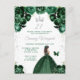 Esta elegante y glamurosa invitación de cumpleaños presenta a una hermosa princesa con cabello oscuro en un vestido de gala verde oscuro. El texto combina letra manuscrita y fuentes modernas sans serif para un look clásico y sofisticado. Los arreglos florales, la mariposa y el confeti plateado crean la combinación perfecta de rústico y chic.