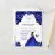 Esta elegante y glamurosa invitación de cumpleaños presenta a una hermosa princesa con cabello castaño en un vestido de gala azul oscuro. El texto combina letra manuscrita y fuentes modernas sans serif para un look clásico y sofisticado. Los arreglos florales, la mariposa y el confeti plateado crean la mezcla perfecta de rústico y chic.