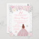 Esta elegante y glamurosa invitación de cumpleaños de invierno presenta a una hermosa princesa con cabello rojo marrón y piel clara en un vestido de baile rosa. El texto combina la escritura a mano y las fuentes modernas sans serif para un aspecto clásico y sofisticado. Las disposiciones florales, los copos de nieve y el confeti plateado crean la mezcla perfecta de rústico y chic.