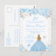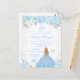 Esta elegante y glamurosa invitación de cumpleaños de invierno presenta a una bella princesa con cabello rubio y piel clara en un vestido azul de gala. El texto combina la escritura a mano y las fuentes modernas sans serif para un aspecto clásico y sofisticado. Las disposiciones florales, los copos de nieve y el confeti de plata crean la mezcla perfecta de rústico y chic.