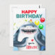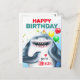 Tiburón sonrojado con sombrero de fiesta y globos.