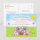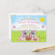 Esta adorable y caprichosa invitación de cumpleaños presenta ositos adorables teniendo un picnic en una tela a cuadros rosa con golosinas como miel, sandía, mermelada de fresa, limonada y pastel. Al fondo hay un cielo azul brillante y sol, mariposas y margaritas. El texto combina fuentes decorativas y serif para un look elegante y moderno. Esto es perfecto para una fiesta de cumpleaños de primavera o verano.