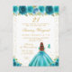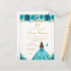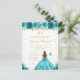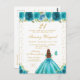 Esta elegante y glamurosa invitación de cumpleaños presenta a una hermosa princesa con cabello castaño rojizo y piel clara en un vestido de baile azul turquesa. El texto combina letra manuscrita y fuentes modernas sans serif para un look clásico y sofisticado. Los arreglos florales, las mariposas y el confeti dorado crean la mezcla perfecta de rústico y chic.