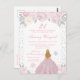 Esta elegante y glamurosa invitación de cumpleaños de invierno presenta a una hermosa princesa con cabello rubio y piel clara con un vestido de baile rosa. El texto combina la escritura a mano y las fuentes modernas sans serif para un aspecto clásico y sofisticado. Los arreglos florales, copos de nieve y confeti plateado crean la mezcla perfecta de rústico y chic.