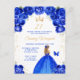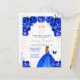 Esta elegante y glamurosa invitación de cumpleaños presenta a una bella princesa con cabello rubio en un vestido de gala azul real. El texto combina letra manuscrita y fuentes modernas sans serif para un look clásico y sofisticado. Los arreglos florales, la mariposa y el confeti dorado crean la combinación perfecta de rústico y chic.