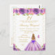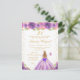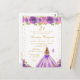 Esta elegante y glamurosa invitación de cumpleaños presenta a una hermosa princesa con cabello rubio y piel clara con un vestido de baile morado. El texto combina letra manuscrita y fuentes modernas sans serif para un aspecto clásico y sofisticado. Los arreglos florales, las mariposas y el confeti dorado crean la mezcla perfecta de rústico y chic.