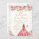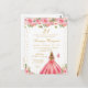 Esta elegante y glamurosa invitación de cumpleaños presenta a una hermosa princesa con cabello rubio y piel clara con un vestido de baile rosa. El texto combina letra manuscrita y fuentes modernas sans serif para un aspecto clásico y sofisticado. Los arreglos florales, las mariposas y el confeti dorado crean la mezcla perfecta de rústico y chic.