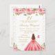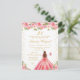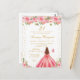 Esta elegante y glamurosa invitación de cumpleaños presenta a una hermosa princesa con cabello castaño rojizo y piel clara en un vestido de baile rosa. El texto combina letra manuscrita y fuentes modernas sans serif para un look clásico y sofisticado. Las disposiciones florales, las mariposas y el confeti dorado crean la mezcla perfecta de rústico y chic.