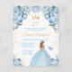 Esta elegante y glamurosa invitación de cumpleaños presenta a una bella princesa con cabello rubio en un vestido de gala azul claro. El texto combina letra manuscrita y fuentes modernas sans serif para un look clásico y sofisticado. Los arreglos florales, la mariposa y el confeti dorado crean la combinación perfecta de rústico y chic.