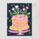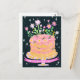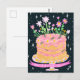 Postal Cumpleaños divertido con pastel y flores rosadas e