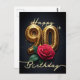 Celebre un magnífico hito con esta impresionante tarjeta postal de cumpleaños número 90. Numerales dorados "90", grabados intrincadamente con patrones en espiral, brillan en el centro. Ubicada con gracia debajo, una vibrante rosa roja, con pétalos en flor perfecta, simboliza la belleza eterna. Una dispersión de delicado brillo dorado añade magia festiva, mientras que la elegante escritura "Feliz cumpleaños número 90" fluye con encanto sofisticado. Recuerde, el texto es completamente personalizable, lo que le permite personalizar este hermoso tributo.