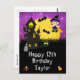 Esta divertida y espeluznante tarjeta de cumpleaños se puede personalizar con un nombre o título, como hija, nieta, sobrina, amiga, etc. Cuenta con una bruja linda junto a una casa embrujada torcida. En el fondo hay una luna llena con murciélagos y un cielo nocturno púrpura con estrellas. El texto combina fuentes decorativas y serif para un look elegante y moderno. Esto es perfecto para Halloween.