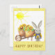 Desea un feliz cumpleaños a tus familiares y amigos con esta tarjeta postal adorable que presenta una ilustración de un girasol amarillo, una carretilla y un conejito!