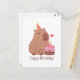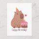Un adorable capybara con un sombrero de cumpleaños está celebrando con un pastel de cumpleaños de chocolate con glaseado rosa y fresas. La divertida leyenda con juego de palabras dice "¡Cumpleaños Cappy!". ¡Perfecto como un saludo de cumpleaños para los amantes de los capybaras!