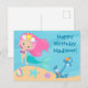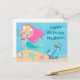 Tarjeta de cumpleaños feliz de sirena personalizada linda que presenta a una adorable niña de pelo rosa con una cola azulada genial nadando junto a hermosas conchas marinas en el océano. Tarjeta postal de cumpleaños de verano genial para una fiesta de piscina o niña de playa.