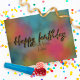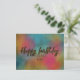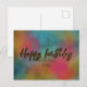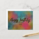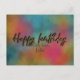 Diseño moderno y trendy de tarjeta postal de cumpleaños personalizada con el texto "Feliz cumpleaños" escrito en letra script con brillo dorado falso sobre un fondo colorido de acuarela.