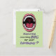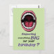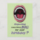 El verso de la parte delantera de la carta con el ilustracion de una gran boca abierta es "¿Esperando algo grande para tu cumpleaños?"