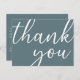 Un fondo gris pizarra. En la parte delantera, letra script grande a mano con el texto: Gracias. Parte trasera: Plantilla para tu nota de agradecimiento y nombre/nombres. Consejo: Si no quieres que se parezca a una postal, haz clic en personalizar, ve a la parte trasera y elimina el divisor y el sello postal.