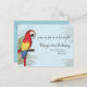 Este diseño presenta una fiesta de animales de pájaros silvestres lindos, una fiesta al aire libre en la piscina de la playa tropical, un loro de la selva colorido fauna silvestre lindo, un simple minimalista minimal moderno, un estilo trendy caligrafía guión, una hoja de hojas de palma botánicas, con follaje verde tropical, una invitación de fiesta divertida y linda, una simple y divertida fiesta de cumpleaños de verano, una isla del paraíso de la selva botánica una postal económica