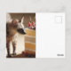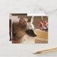 Send a charming note with a postcard featuring a detailed illustration of a brown hyena pup intently studying a towering layer cake with fresh berries. Elegant, whimsical, and visually striking.