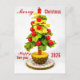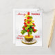 Christmas tree made of lettuce leaves strung on a wooden skewer. Cherry tomatoes are used as decorations, and red pepper is used instead of a star at the top. The tree is mounted on a stand made of a slice of pineapple. Personalized text.