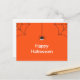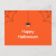 Postcard muestra una araña negra colgando en una telaraña, el texto de "Halloween feliz", y telarañas en las esquinas. El fondo es naranja de Halloween. Súper lindo para Halloween, truco o trato, octubre, fiestas, escuela, compras y más. Bonito y adorable diseño de temporada.