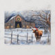 Super cute longhorn cow with a Santa hat standing in the snow with a barn with a Christmas tree and wreath. It says "Season's Greetings" on the back.