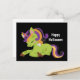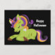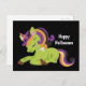 Una postal con la imagen de un unicornio Frankenstein. Colores púrpura y verde. Qué lindo.