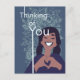 Una chica linda haciendo una señal de corazón con patrones florales en el fondo. ¡Un divertido y cariñoso patrón floral azul diseñado para una tarjeta de Pensando en Ti!