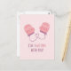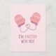 Una postal con un lindo ilustracion de un par de mitones de invierno rosados y púrpura conectados por una cuerda que se desliza en forma de corazón. El dulce texto de un juego de palabras dice "¡Estoy muy entusiasmado contigo!" ¡Oh! Perfecto para las ocasiones románticas de Día de San Valentín o amor.