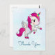 Tarjeta de agradecimiento con un unicornio alado blanco con crin, cola y pezuñas rosas. El cuerno tiene anillos de colores del arcoíris y parece una piruleta de caramelo. Este lindo unicornio se levanta sobre sus patas traseras. Corazón rosa dulce en su mejilla.