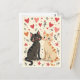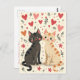 Two cute cats, one dark and one light-colored sit happily beside each other surrounded by hearts and flowers in a retro design.