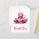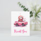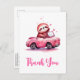 Thank You postcard with an adorable illustration. A happy looking sloth sitting in a sporty pink convertible. Waving as he drives by. With hearts floating upwards.