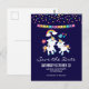 Tarjeta postal de fiesta de guardar la fecha con 2 adorables unicornios bailarines con colas y crines brillantes y coloridas. Un arcoíris colorido con nubes a cada lado encima de sus cabezas. Otros elementos incluyen una pequeña flor, un corazón y algunas estrellas. Fondo morado oscuro. Imagen de confeti de colores y una bandera de banderines a lo largo de la parte superior.